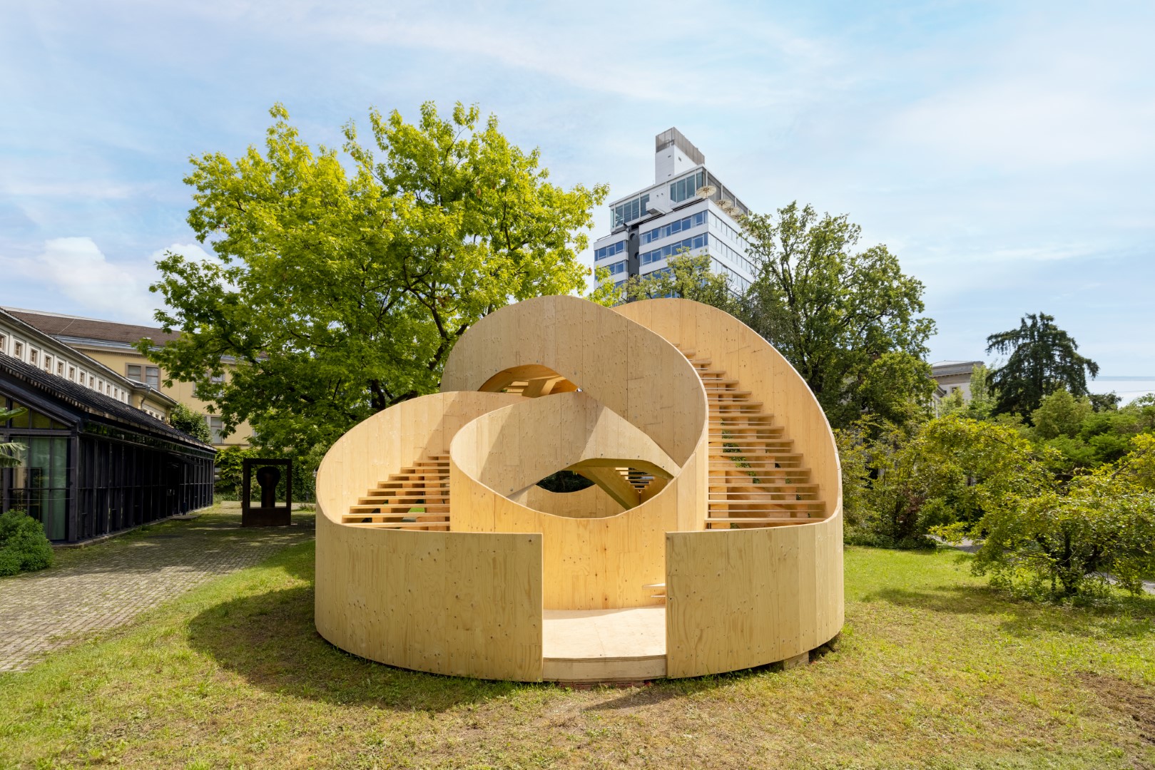 Die Skulptur reizt die Fortschrittlichkeit des Baustoffes Holz aus und stellt dessen ökologische Bedeutung ins Zentrum. INFINITY ist eine gebaute Aufforderung für ein Denken und Handeln in Kreisläufen. Die zwei begehbaren Brücken, die sich schwebend aufspannen und kreuzen, bilden aus der Vogelperspektive das Unendlichzeichen. Bei Begehen der dreidimensionalen Endlosschlaufe ergeben sich in jeder Runde neue Perspektiven auf die Skulptur, die Gegebenheiten des Standorts und damit auch auf die Bedeutungstiefen von Entstehung, Vergänglichkeit und Unendlichkeit. Wer hingegen um das materialisierte Unendlichzeichen herum geht, nimmt von Schritt zu Schritt die Kraft wahr, mit der die fliessende Form des Objekts in Bewegung zu geraten scheint.