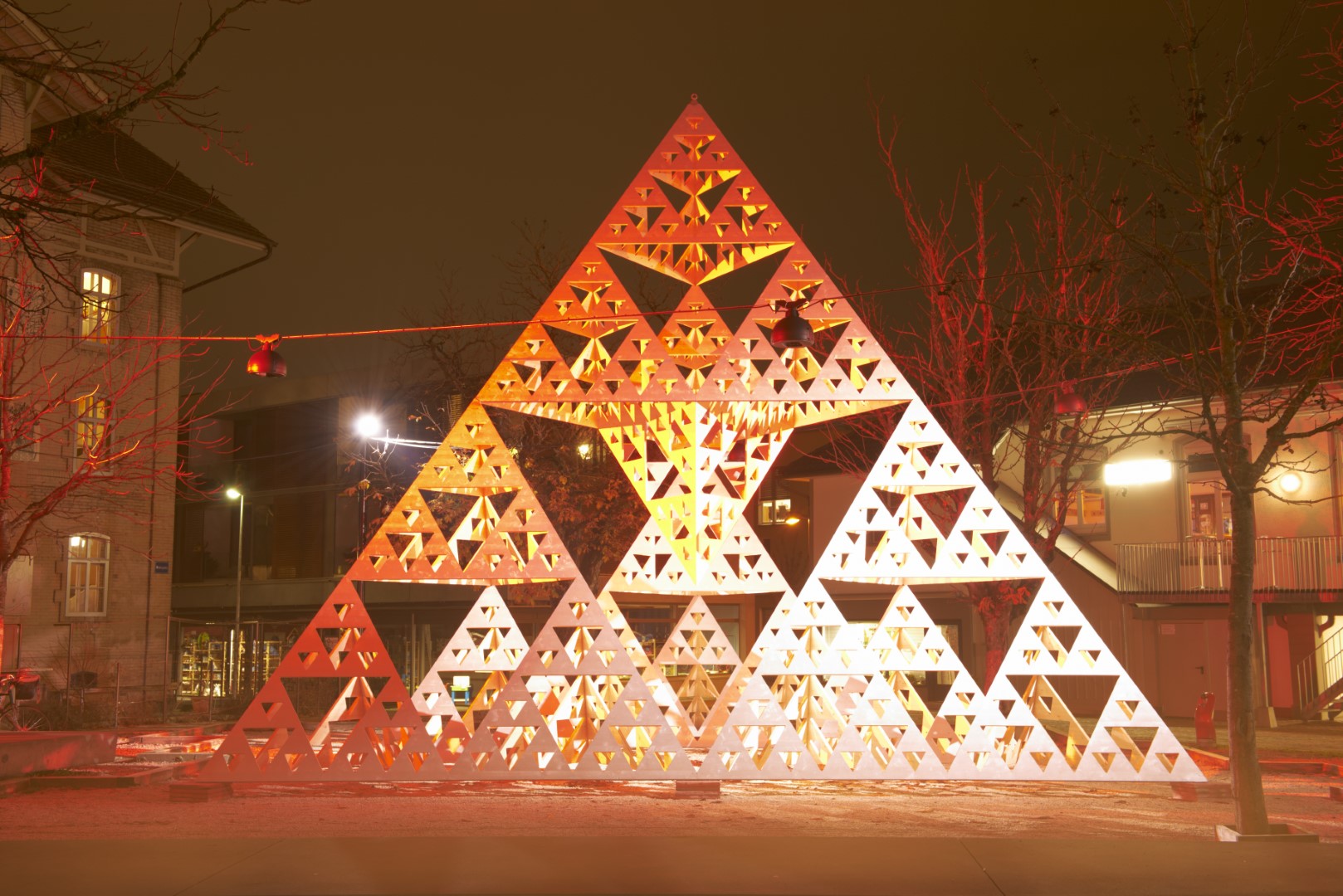 FRAKTAL besteht aus einer einzigen Vorlage, nämlich aus einem aus einer Dreischichtplatte gefrästem, gleichschenkeligem Dreieck mit gefrästen Aussparungen (Sierpinski-Dreieck). Vier dieser Dreiecke bilden einen gleichflächigen Tetraeder (Sierpinski-Pyramide). Die Montage vier dieser Tetraeder bildet die nächste übergeordnete Raumeinheit – wieder einen gleichflächigen Tetraeder. FRAKTAL besteht aus insgesamt 17 Tetraedern. Die entstandene Pyramide hat eine Seitenlänge von 9.60 m und eine Höhe von 7.80 m. Im Zentrum von FRAKTAL strahlt eine Leuchte, die aus acht Tetraedern besteht. Diese sind im Masstab 1:100 verkleinert und mit dem 3D-Drucker hergestellt.