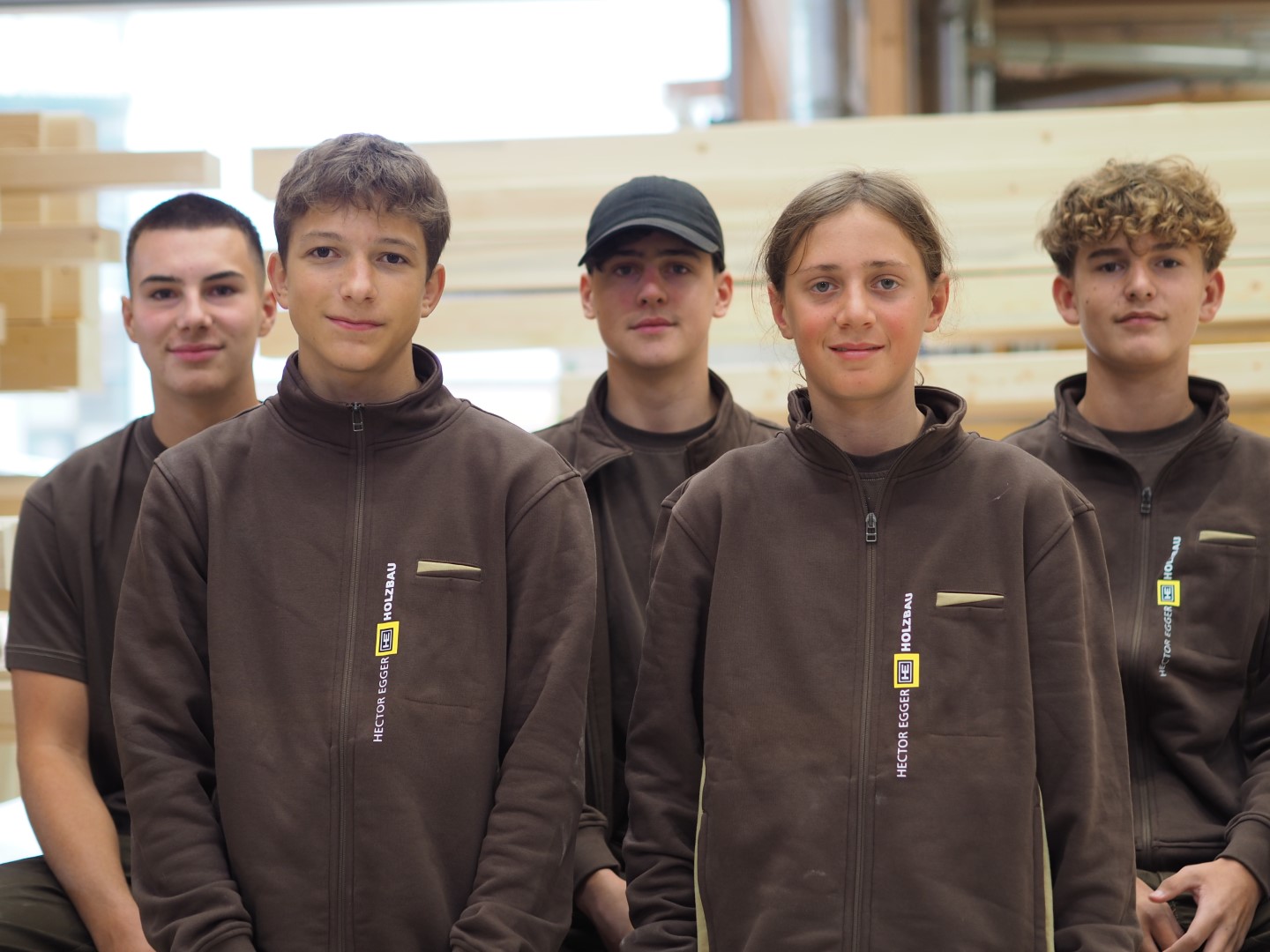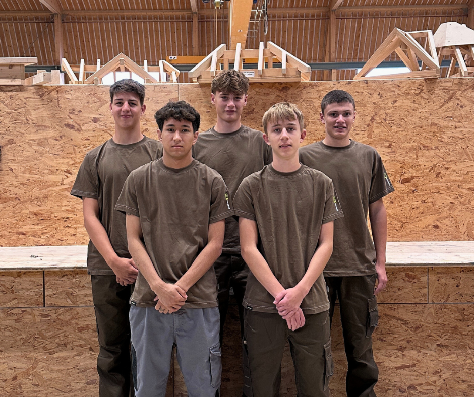 Ben Ducommun, Robin Lambregtse, Valentin Müller, Ruhollah Amiri, Matteo Schärer starten ihre Lehre als Zimmermann EFZ bzw. Holzbearbeiter EBA bei der Hector Egger Holzbau AG.