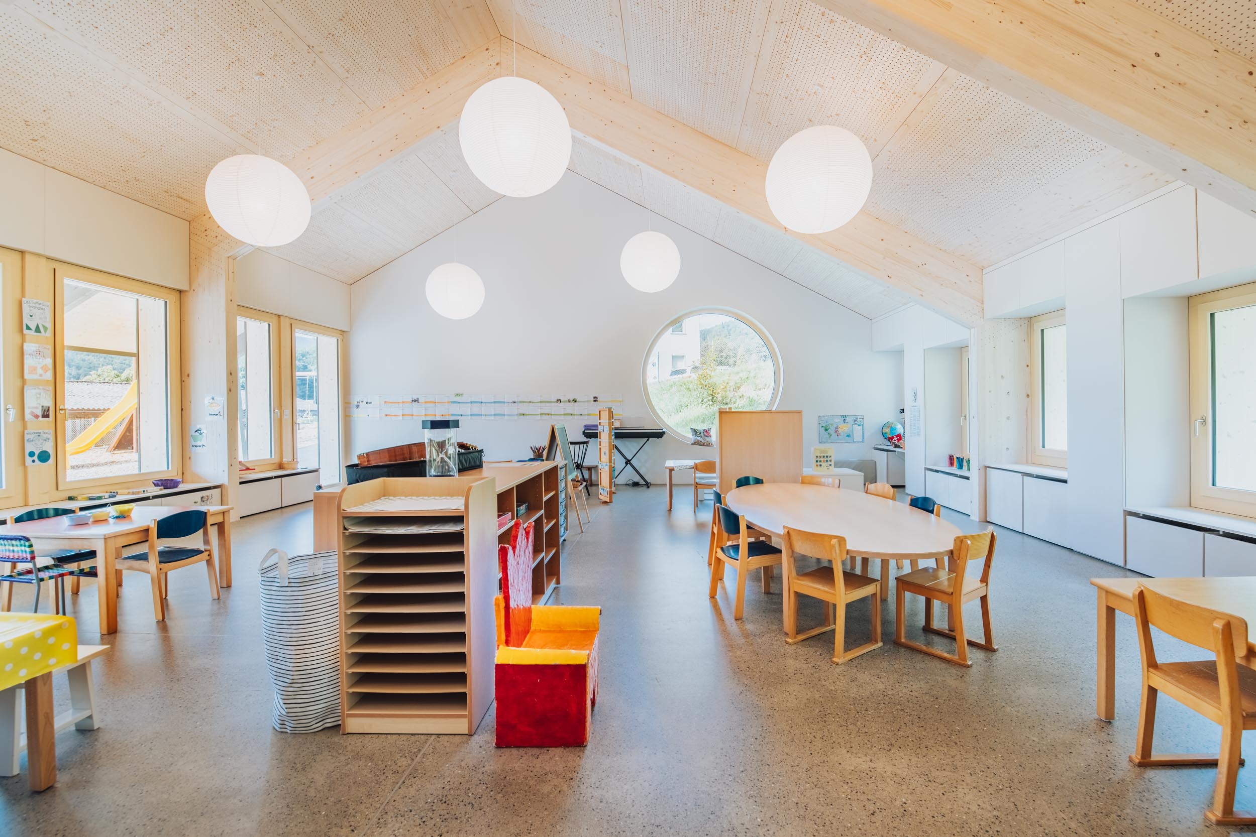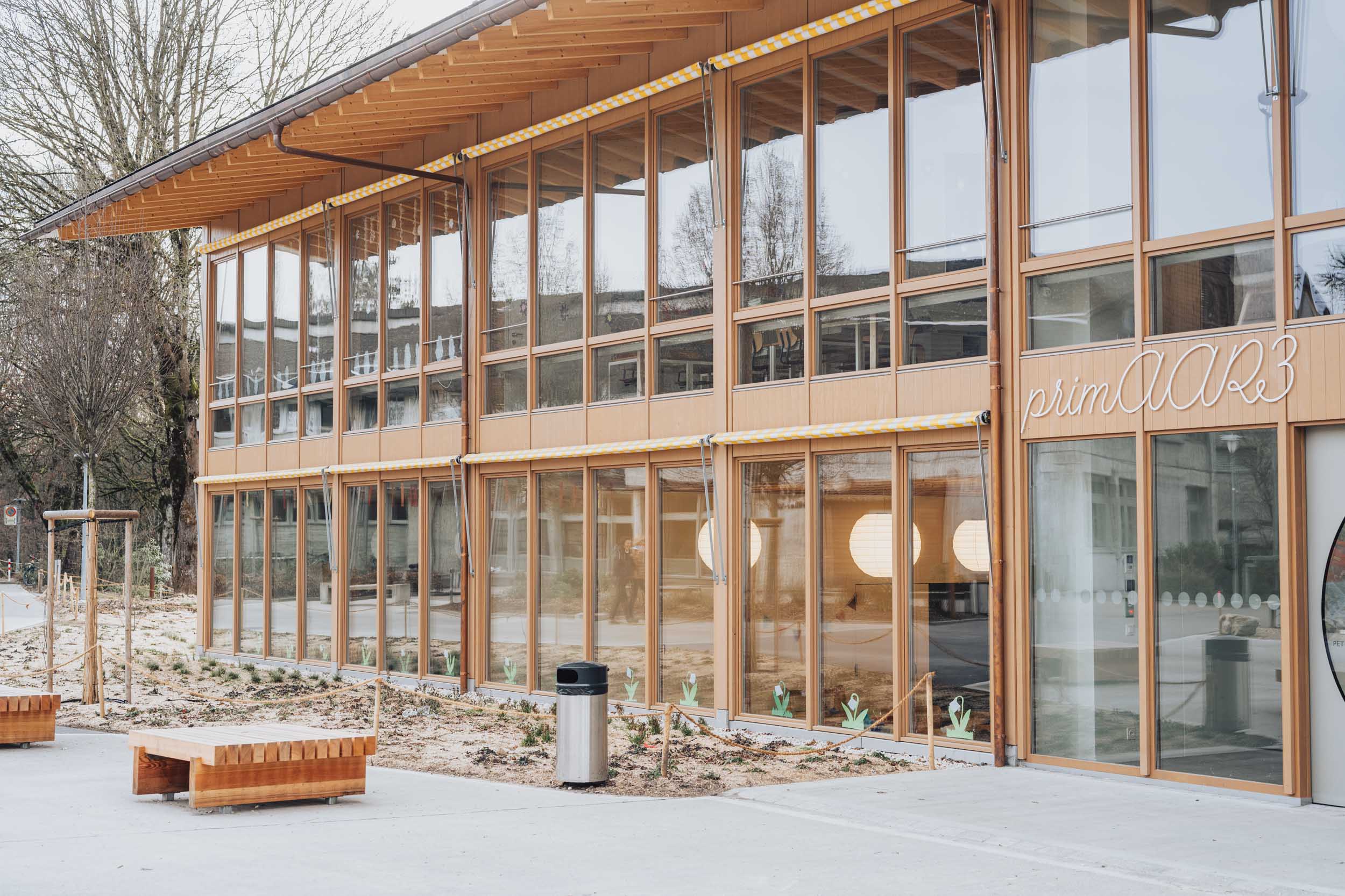 Holzfassaden sind ein schlechter Wärmeleiter, sie heizen sich nicht auf und die Aussenräume sind auch bei Hitze angenehm (Kindergarten, Schulen etc.)